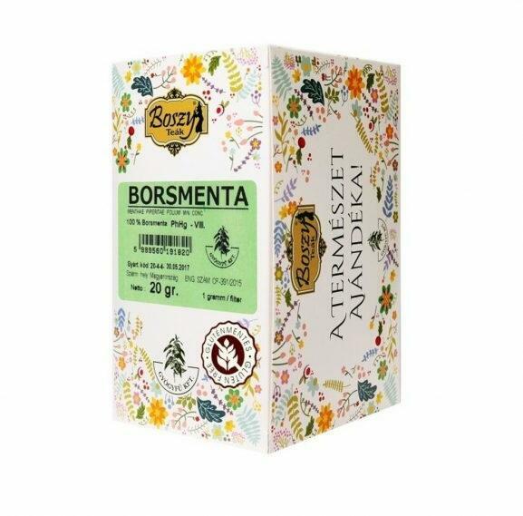Élvezeti teaként korlátozás nélkül, nagyobb mennyiségben fogyasztható. Összetevők: borsmentalevélKiszer elés: 20 db filter/doboz, aromazáró csomagolásbanTömeg: 20x1 gAZ ÖSSZETEVŐK HATÁSAIborsmentalevél:Rápóti-Romvár i - Gyógyító növényekTeája mindennapi reggeli vagy üdítő italként, de gyógyszerként is egyaránt értékes. Használható magában vagy teakeverékekben, étvágygerjesztőnek, szélhajtónak, epeműködést serkentőként, idegnyugtatónak, görcsoldónak menstruációs zavarok esetén, az emésztőcsatorna és a húgyutak fertőtlenítésére, gyomor- és bélhurut, fejfájás, epekőkólika ellen. Torokbántalmak és rekedtség ellen gargarizmaként, gyulladásokra borogatóként alkalmazzák. „